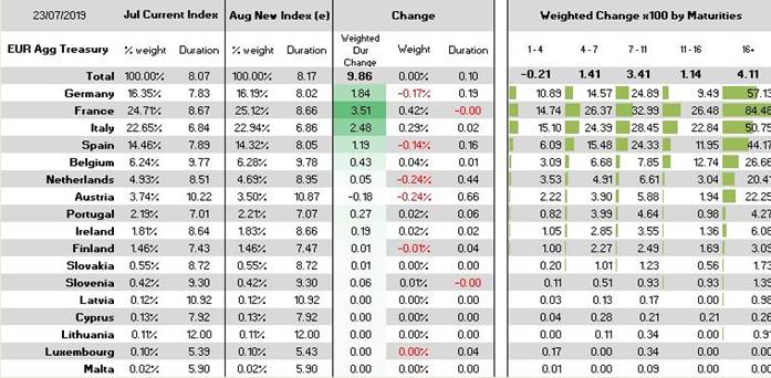 Month-end changes should be supportive across all EGBs, except the Netherlands and Finland. The French index is projected to extend the most, its largest extension since end-Feb’19. The extension in the Italian and Austrian indices should be their largest since end-Feb’19 and end-Sep’17 respectively.