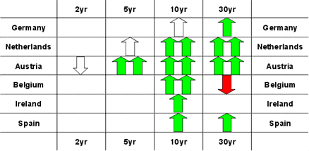 Below we show the distributions of weighted duration changes (charts on the left) and curve splits (charts on the right) of the projected changes. As shown in the charts, the extensions in 10/30yr Netherlands, 5/10/30yr Austria and 10yr Belgium stand out.